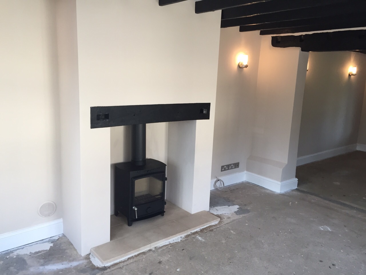 Replacement of Dated Open Fire with New Modern Log Burner and Oak Beam