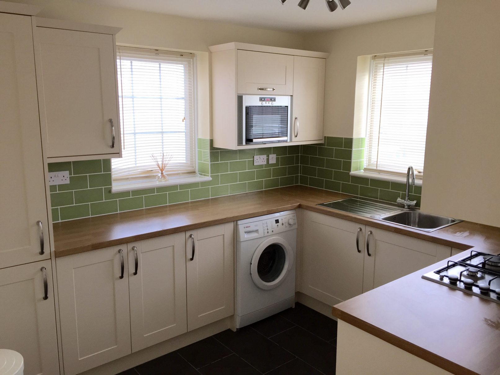 Shaker-style Kitchen with Oak Block Laminate Worktops and Porcelain Tiled Floor